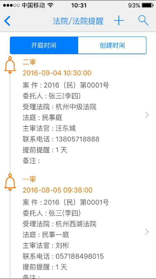 開庭提醒:可以自設置提前幾天提醒,開庭2小時前,系統默認再次提醒