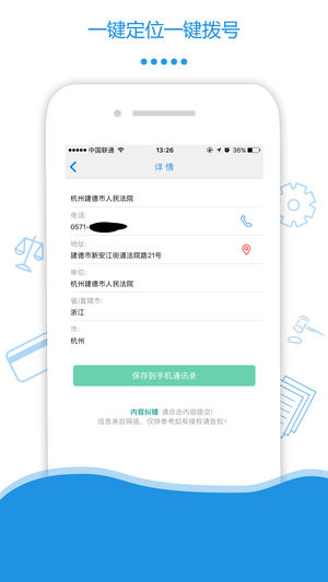 全國各地司法機關電話輕松查詢,一鍵撥號,快速保存到手機通訊錄,簡單快速。