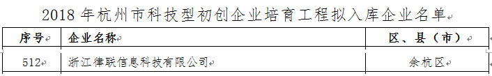熱烈祝賀律聯科技入庫“2018年杭州市科技型初創企業培育工程”