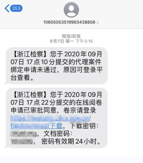 案件承辦檢察機關受理申請后,律師會收到浙江檢察APP平臺發(fā)來的服務已辦理的短信提醒,在互聯(lián)網電腦上打開短信預留的鏈接地址,經掃碼、動態(tài)人臉核驗通過后,即可下載代理案件的電子卷宗。申請通過后,須在24小時內進行下載。